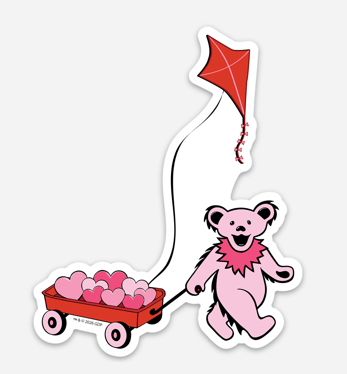 Grateful Dead Bear With Wagon Of Hearts Sticker. Add some heady flair wherever you spread love with this adorable Bear With Wagon Of Hearts Sticker. Featuring bright colors and a heart-filled design, it’s a cheerful way to share the love with fellow Dead Heads.