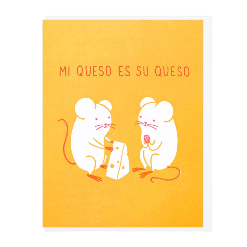 Mi Queso Es Su Queso Greeting Card. Celebrate friendship and fun with the Mi Queso Es Su Queso Greeting Card! Featuring a playful pun and vibrant design, this card is perfect for sharing a cheesy smile with someone special. Whether for birthdays, thank-yous, or just because, its lighthearted message makes every occasion brighter. Let this card bring a dash of humor and warmth to your heartfelt notes, reminding loved ones that your queso is always theirs to enjoy!
