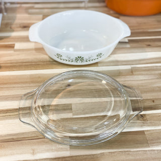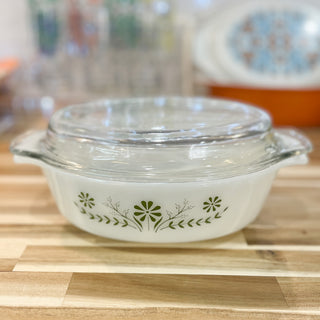Vintage MCM Fire King 433 Casserole Dish Green Flowers with Lid