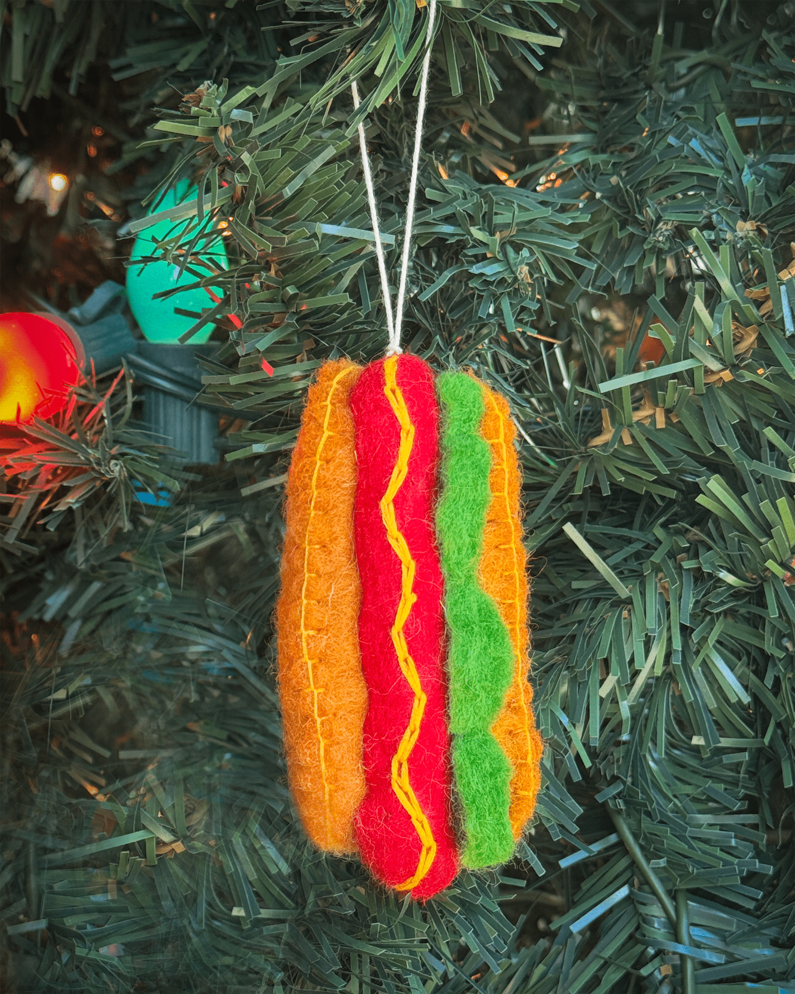 Felt Hot Dog Ornament - Add a dash of whimsy to your holiday decor with this charming Felt Hot Dog Ornament.