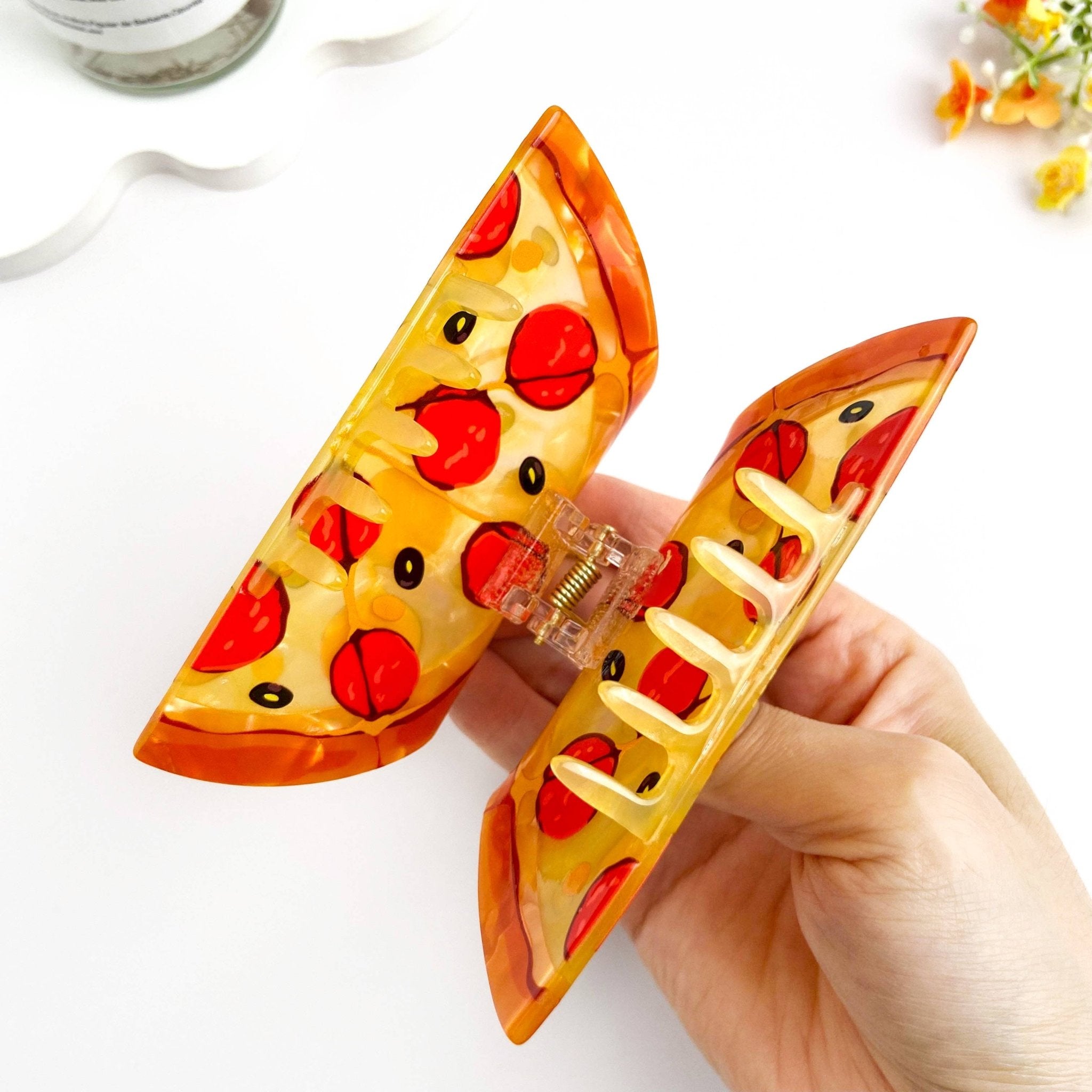 Pizza Hair Claw Clip - Add a slice of fun to your hairstyle with the Pizza Hair Claw Clip! This playful accessory features a vibrant, cheesy pizza design that's sure to spark conversations and smiles.