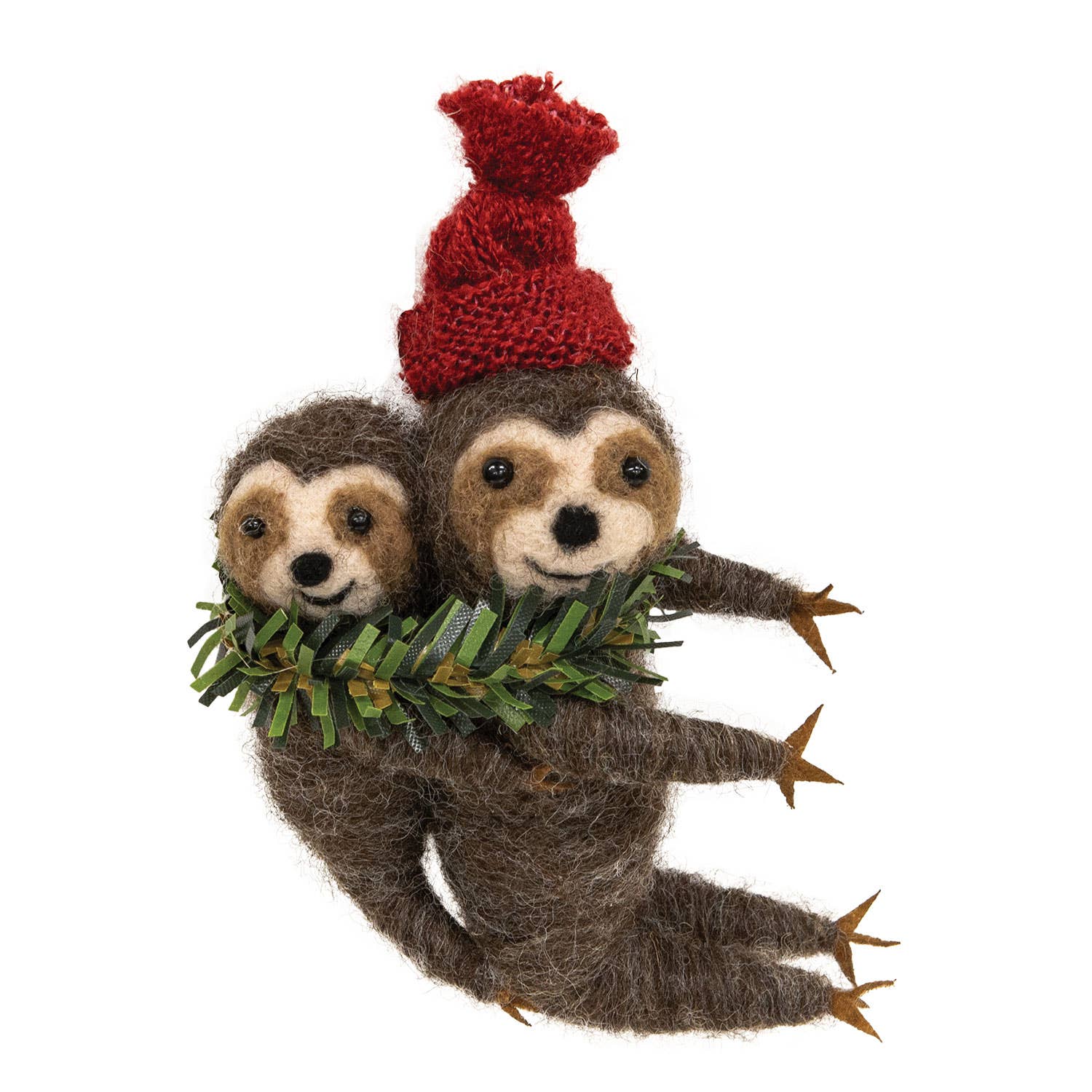 This Sloth and Baby Felted Ornament is here to bring some slow-motion cuteness to your customers' shelves. This holiday ornament features a sweet sloth with a tiny baby sloth clinging to its back. The momma sloth sports a festive knit red hat and a green pine garland acts as a scarf adding a touch of woodland holiday cheer. Prop the ornament in a tree branch for a festive touch. Measures 4.75" high.