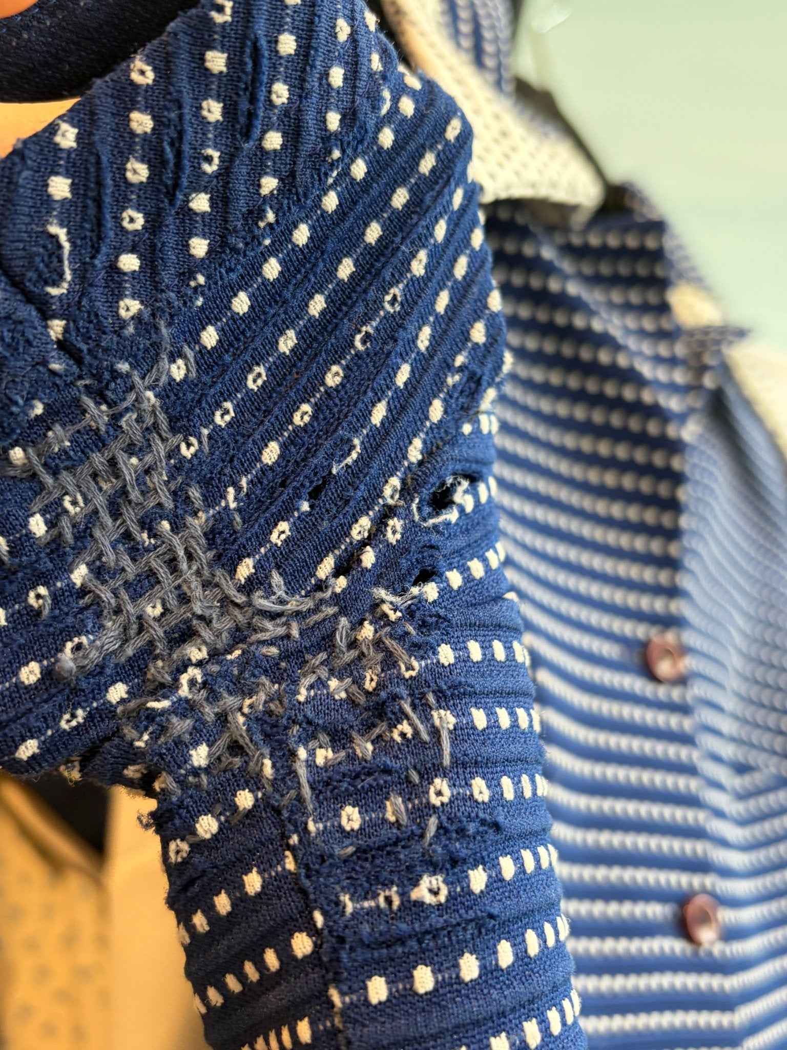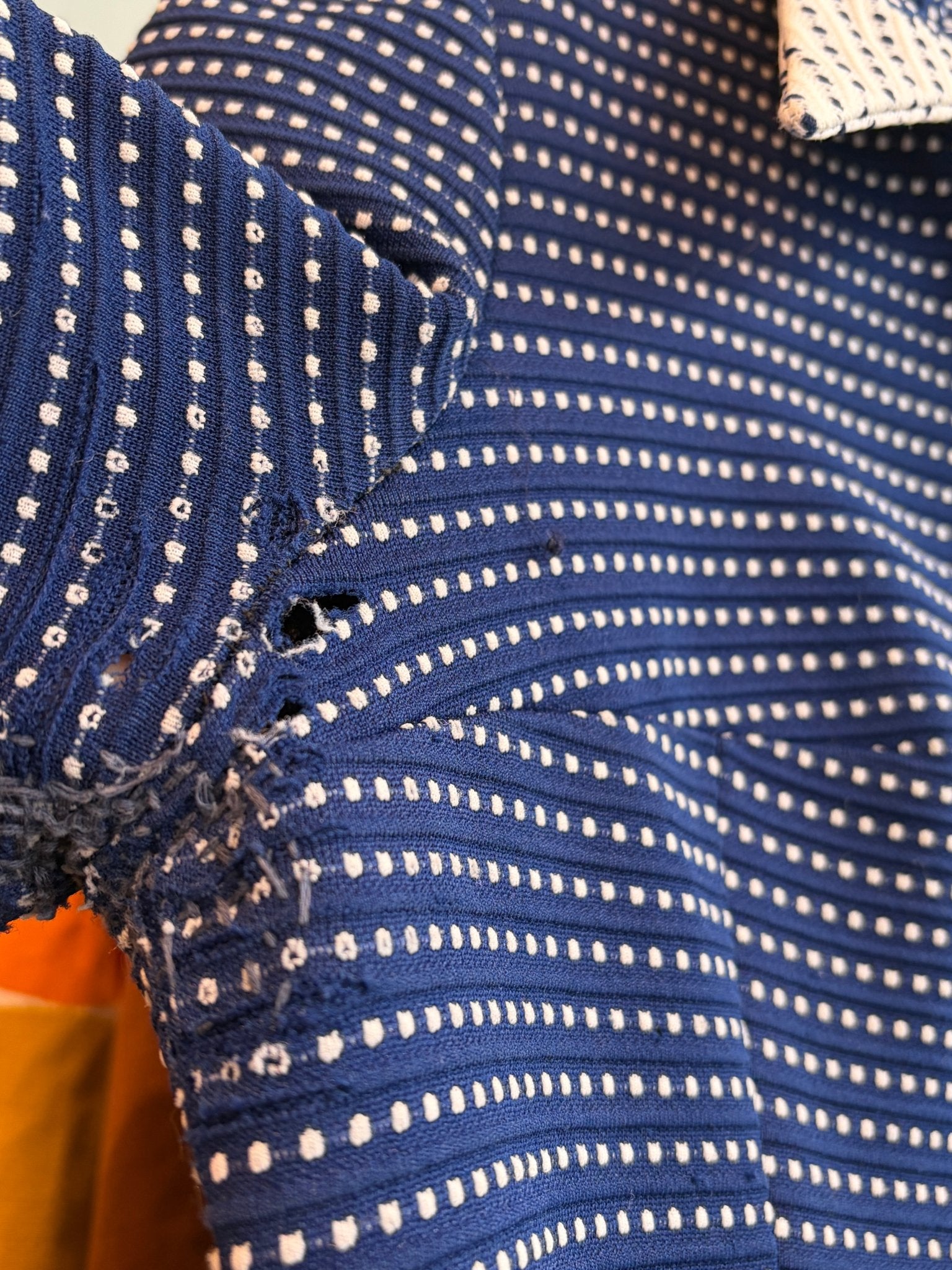 Dress has some wearing in both underarm areas, left side has been visibly mended but still has some small holes, right side is in slightly better condition but still shows signs of wear. Small stain on left side of collar.
