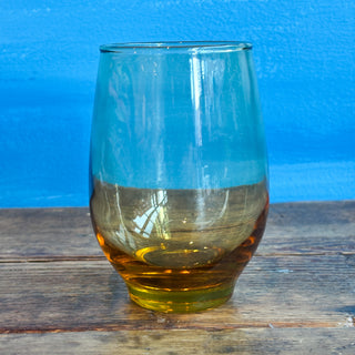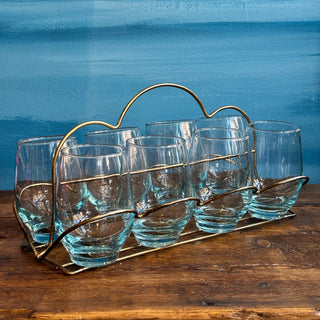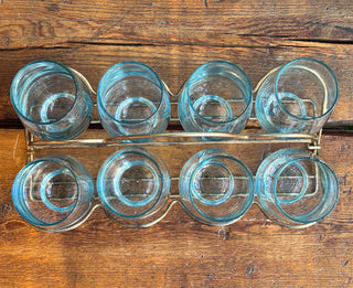 Vintage MCM Libbey Aqua Blue Tear Drop Round Juice Glasses With Original Gold Tone Caddy
