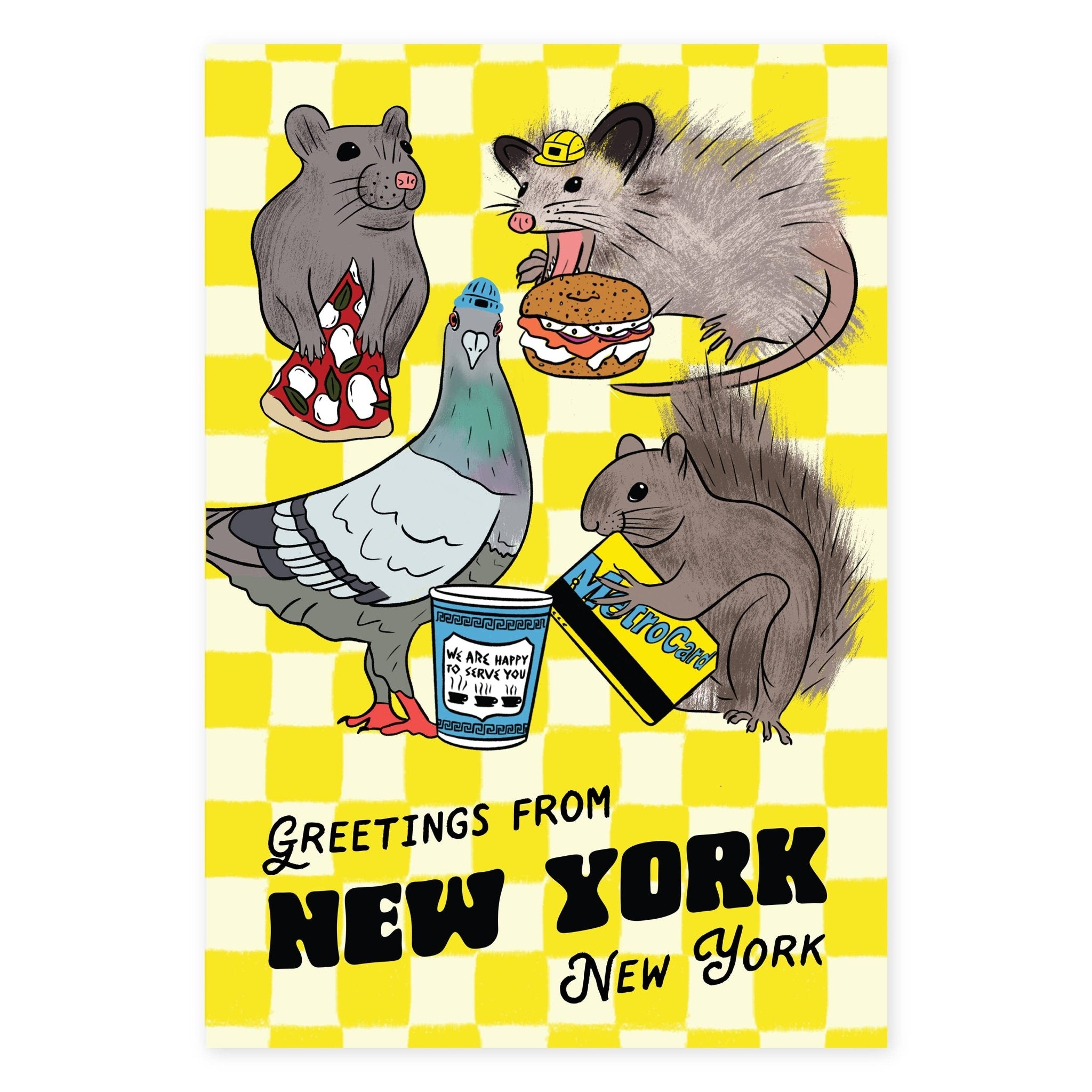 - Postcard reads "Greetings From New York" and features illustrations of pizza rat, a pigeon with a coffee cup, a squirrel with a metrocard, and a possum feasting on a bagel.