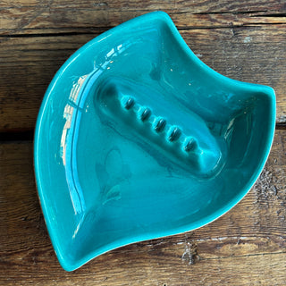 Vintage MCM Libbey Aqua Blue Tear Drop Round Juice Glasses With Original Gold Tone Caddy