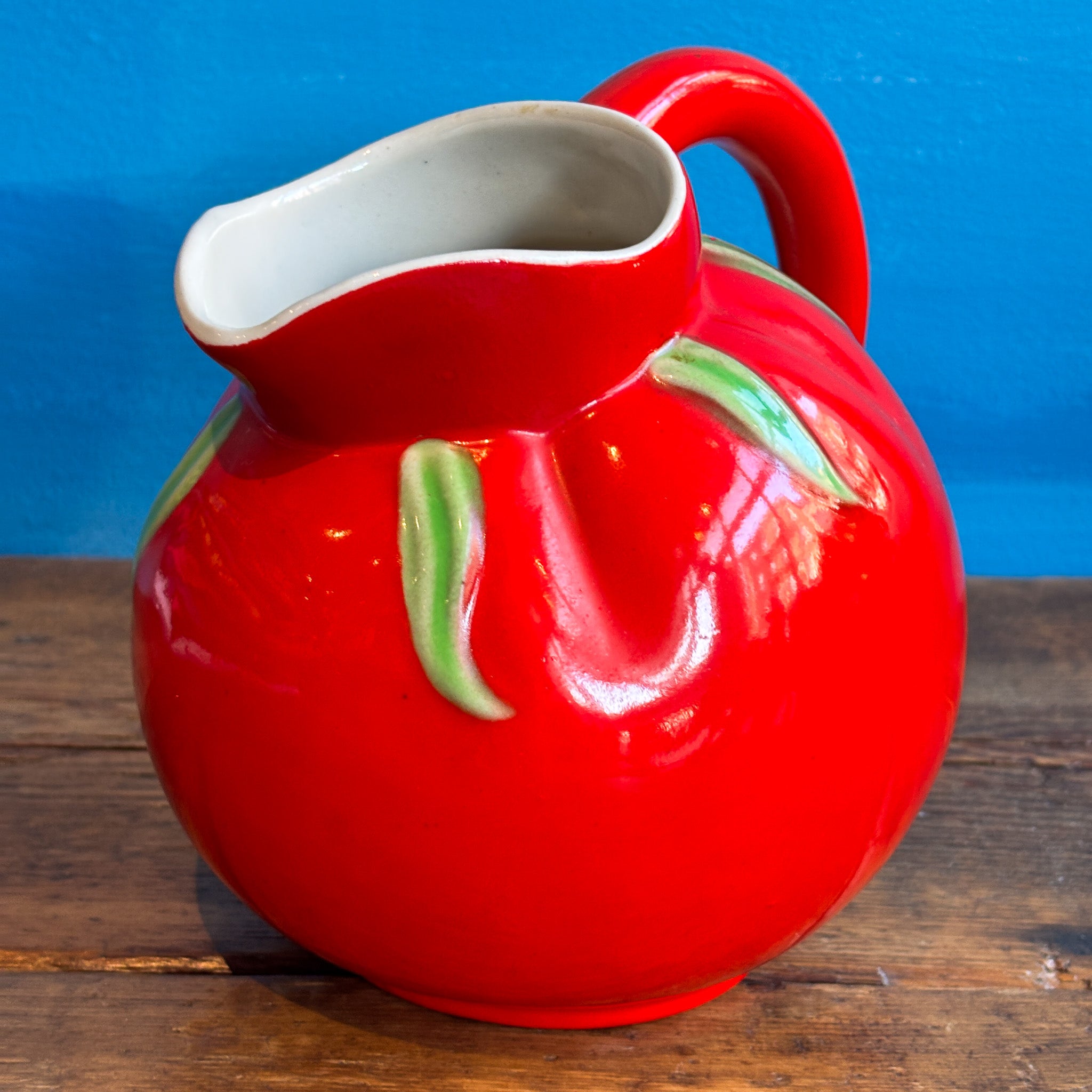 Antique 1940's Pantry Party Red Tomato Pitcher Jug. Bring a splash of retro charm to your kitchen with this delightful Antique 1940's Pantry Party Red Tomato Pitcher Jug! This whimsical piece captures the playful spirit of mid-century Americana with its cheerful tomato-shaped design and vibrant red glaze. Perfect for serving lemonade at summer gatherings, displaying fresh flowers, or simply adding a pop of vintage personality to your shelves, this pitcher is a conversation starter that celebrates the fun, quirky side of classic kitchenware!