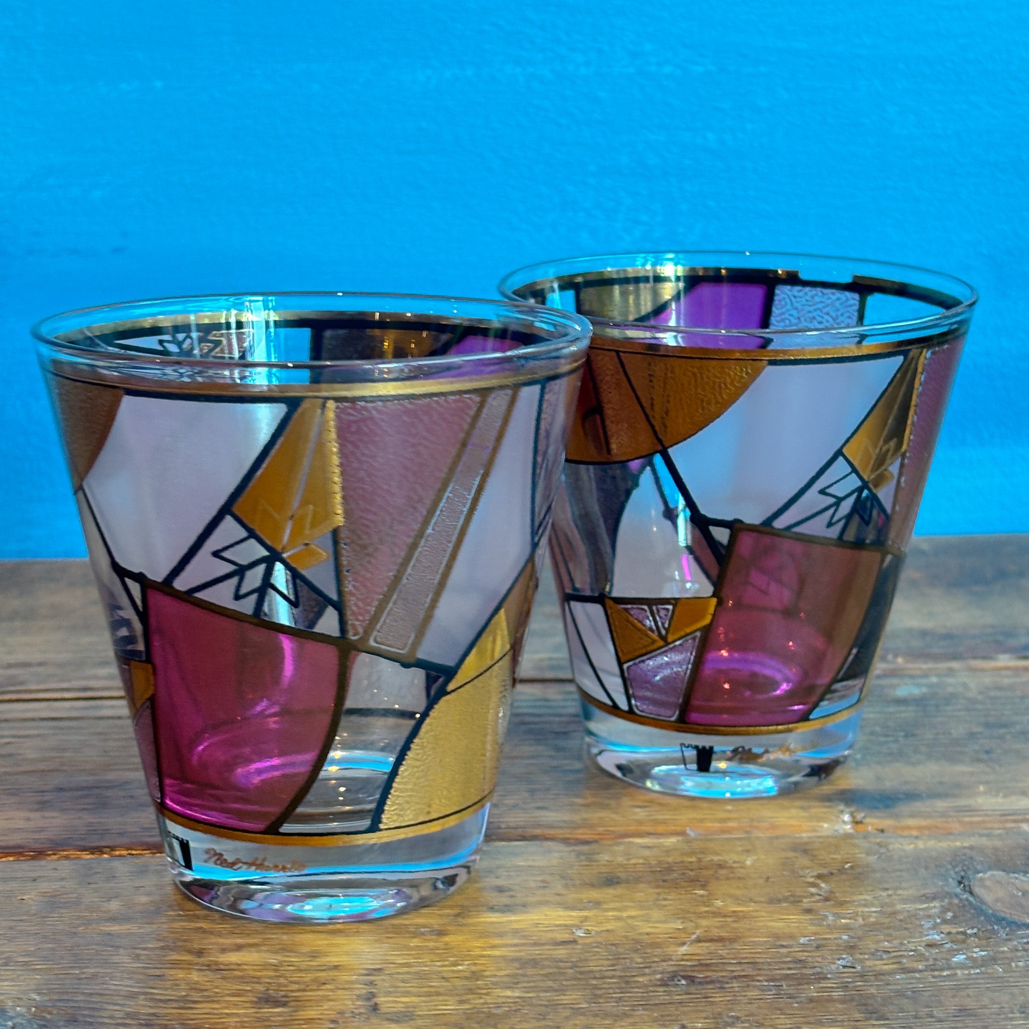 Raise a glass to retro glamour! These vintage MCM rocks glasses by Ned Harris are pure mid-century magic wrapped in pink stained glass and gilded gold details. Crafted during an era when every sip deserved a touch of sophistication, these stunners showcase the artistry and whimsy that defined the golden age of design!