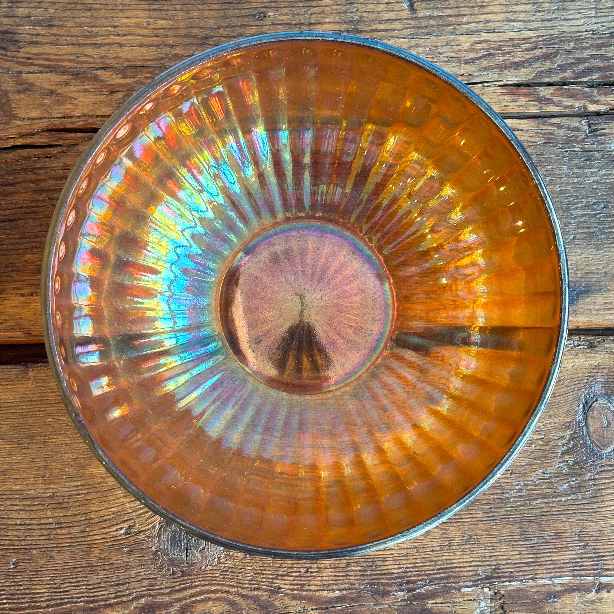 Vintage MCM Marigold Amber Carnaval Depression Glass Bowl. Step back in time with this stunning Vintage MCM Marigold Amber Carnaval Depression Glass Bowl—a true gem from the golden age of glassware! This beauty showcases that iconic iridescent marigold hue that makes carnival glass so utterly mesmerizing, with rich amber undertones that catch the light in the most magical way!