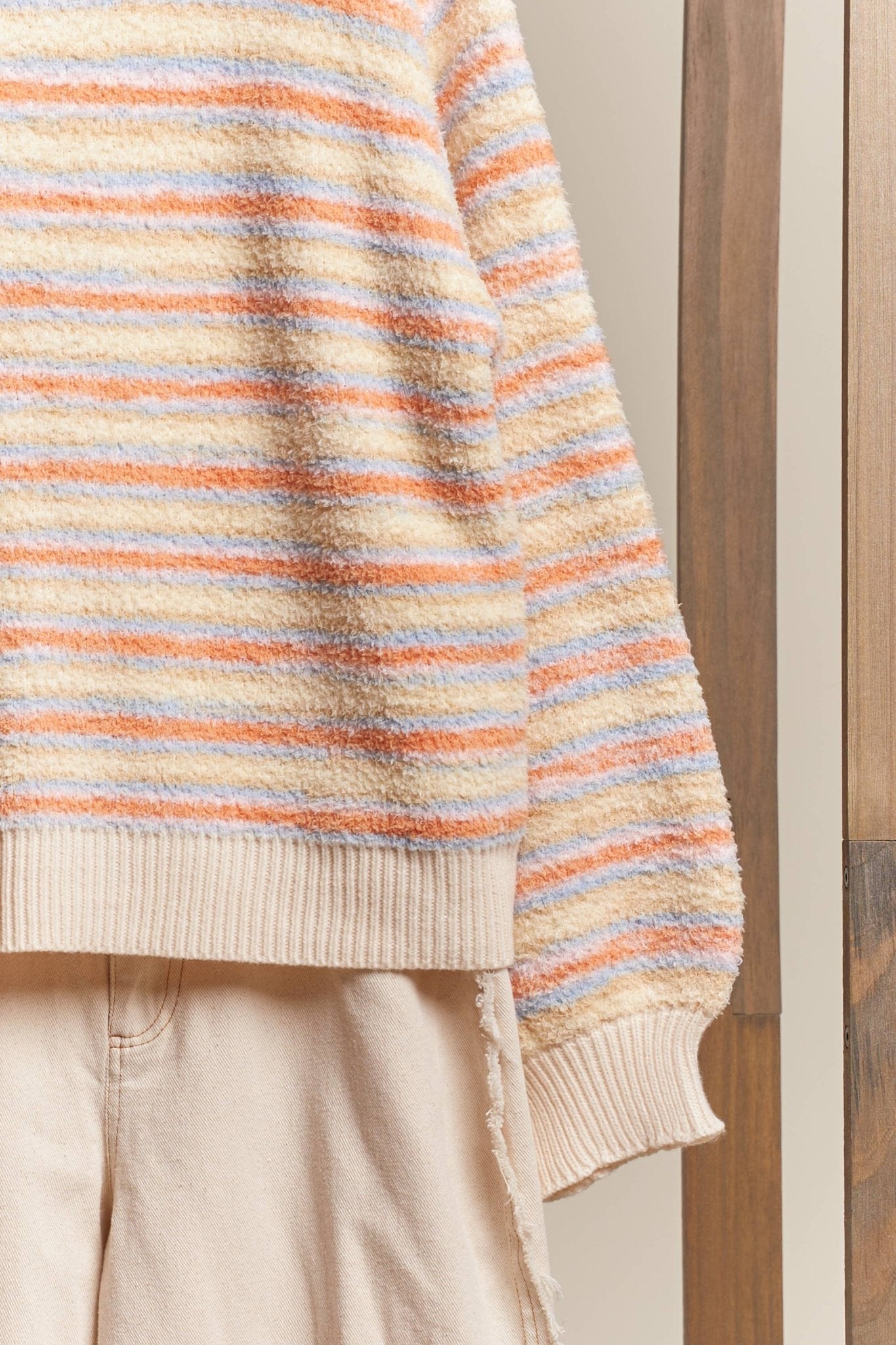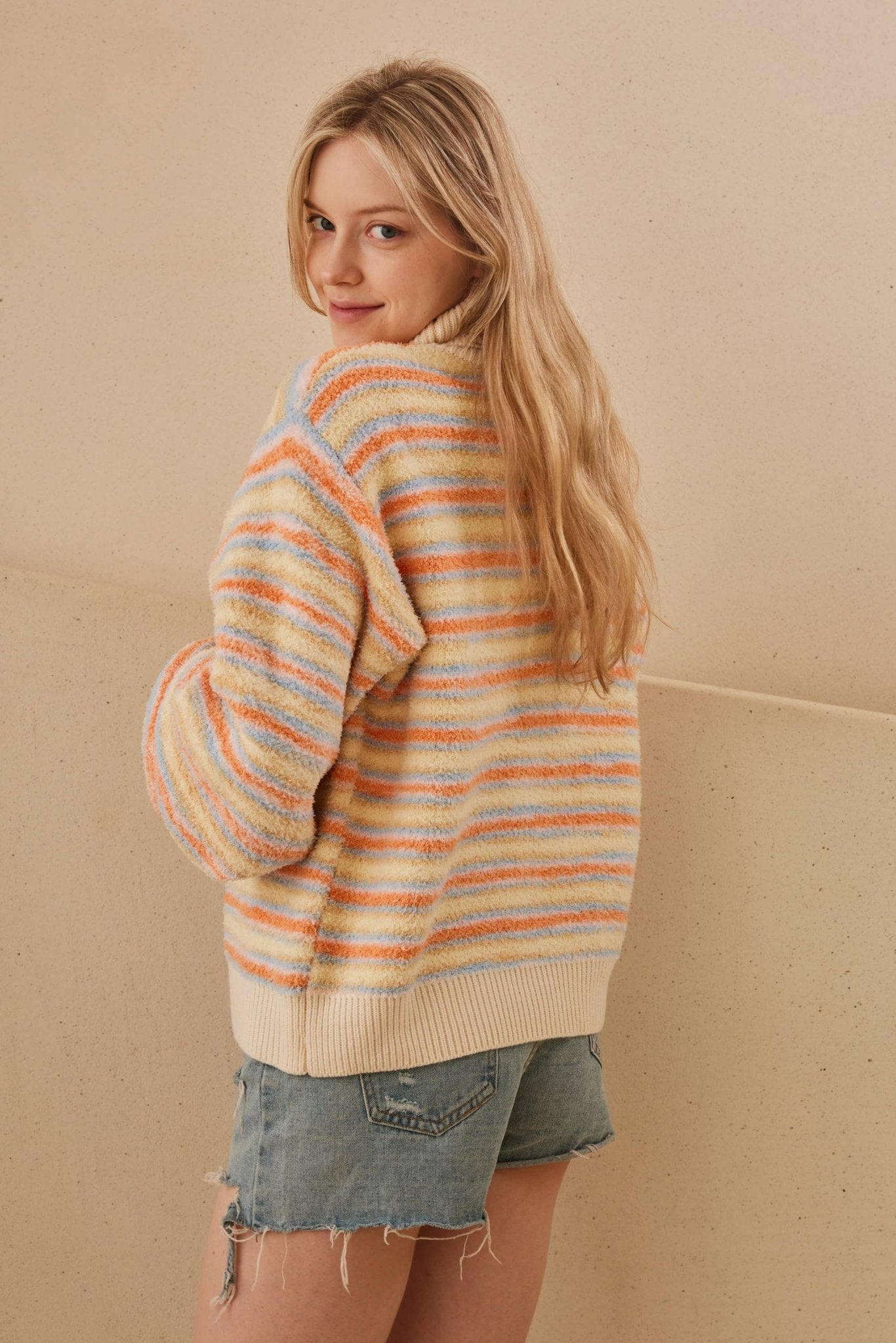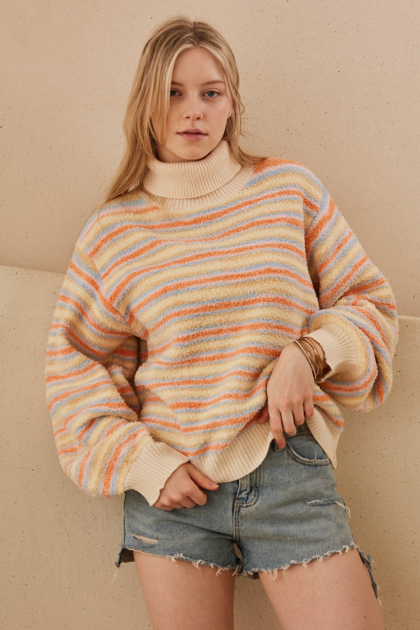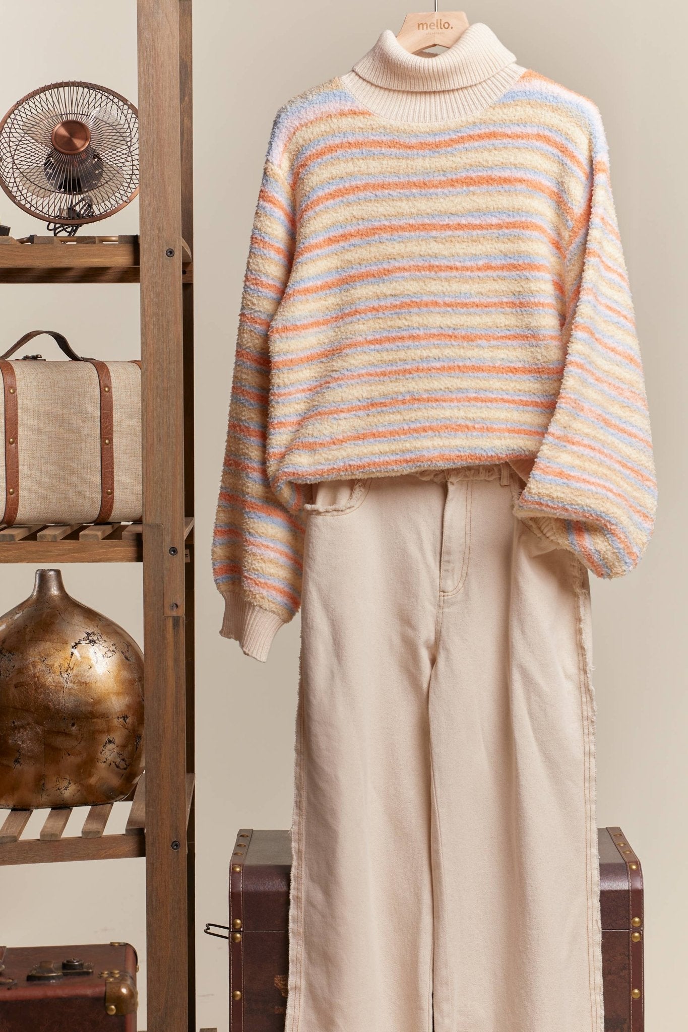Turtle Neck Striped Sweater. Elevate your wardrobe with the Turtle Neck Striped Sweater, designed for both comfort and style. Featuring a classic turtle neck that keeps you cozy in cooler weather, this sweater showcases timeless stripes that add a touch of sophistication to any outfit!