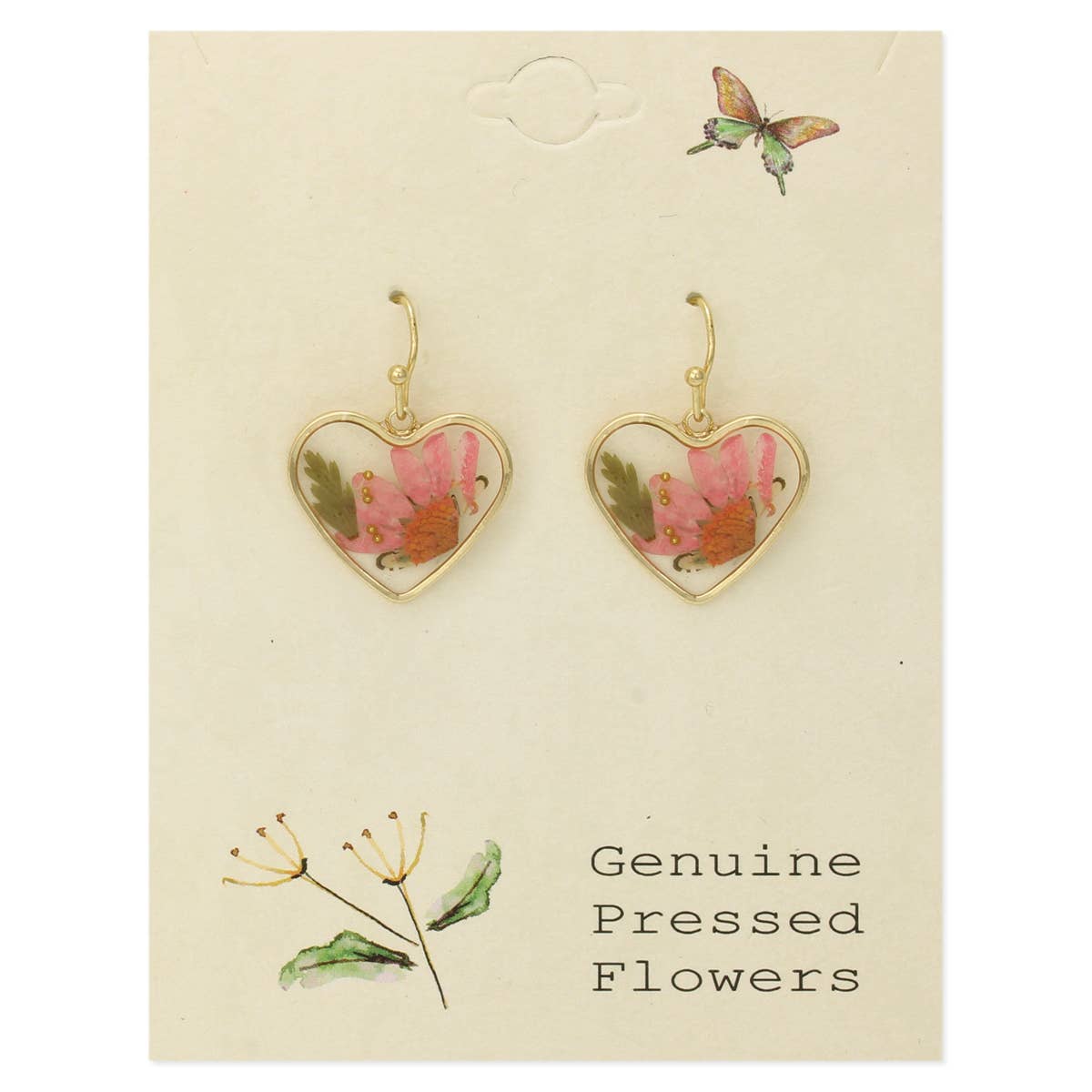 Cottage Floral Dried Flower Heart Earring. Bring home cottage style with genuine pressed flower jewelry! These delicate gold heart earrings feature dried flowers set in clear acrylic with a gold border.