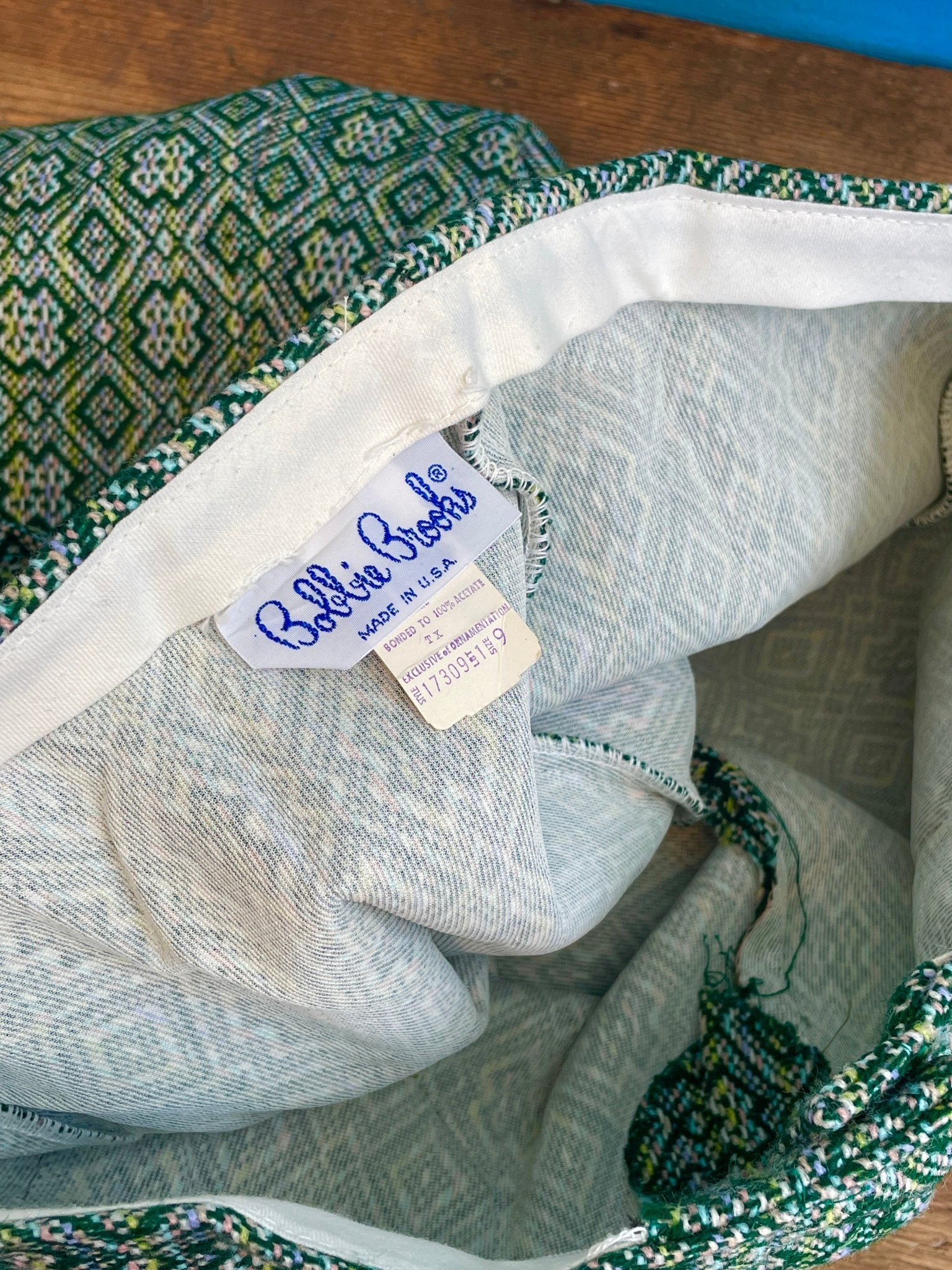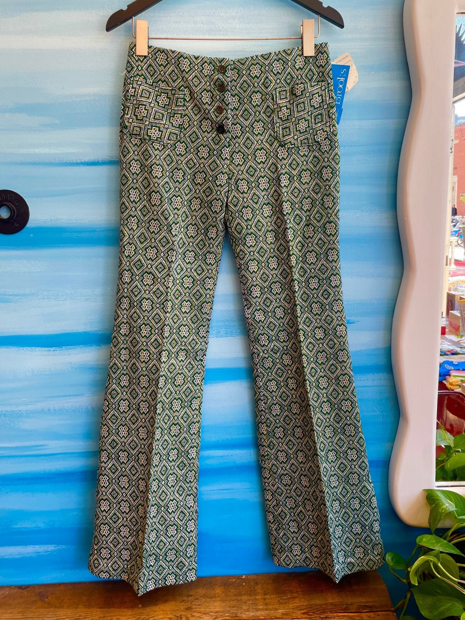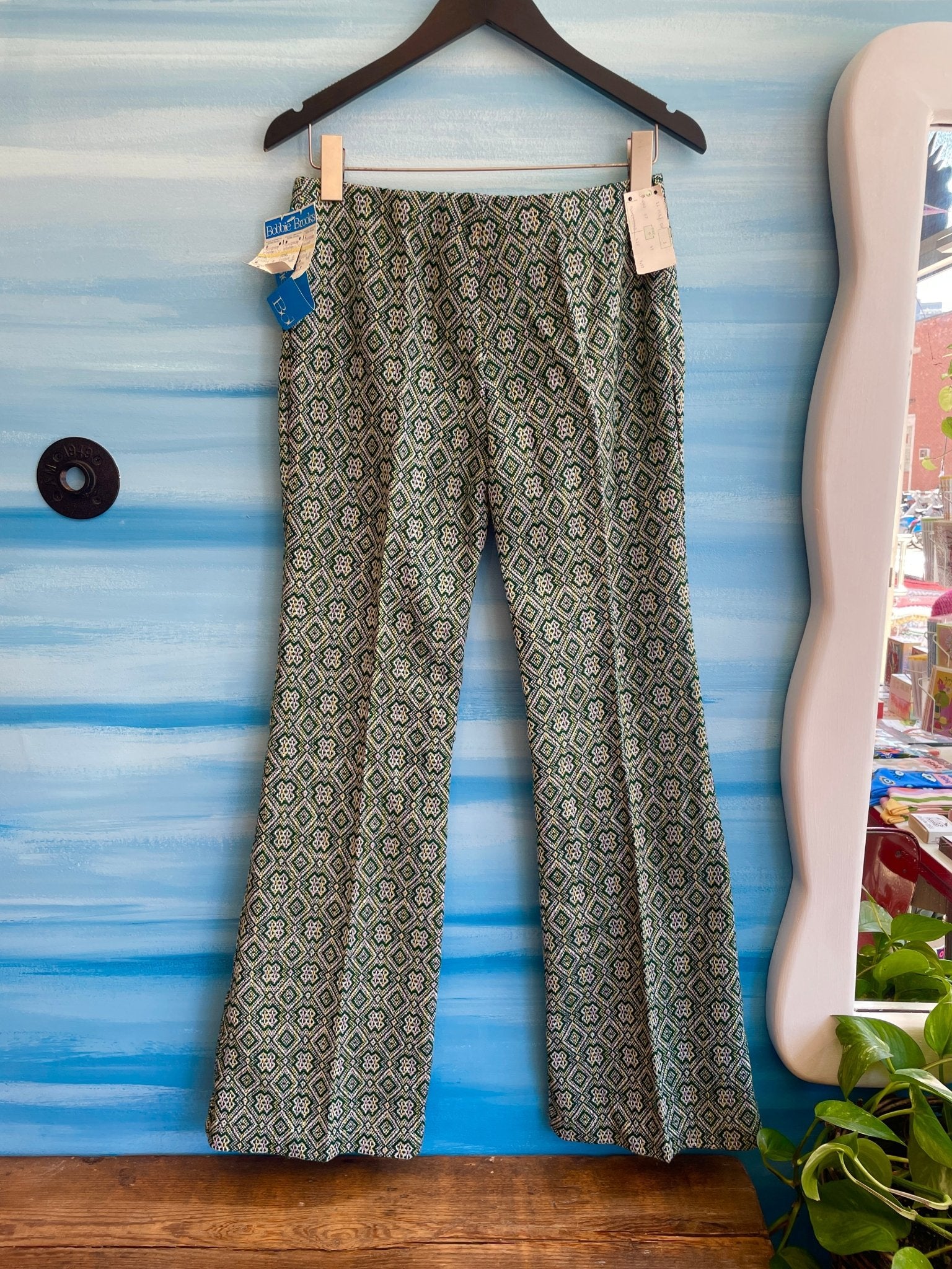 Vintage 1960s 1970s Bobby Brooks Green Flare Pants DEADSTOCK with Tags. These pants are more than just a vintage piece - they're a brand new addition to your wardrobe! With their deadstock quality and tags still attached, you'll be the first to sport these groovy green wool bell bottoms from the iconic Bobby Brooks. Talk about a one-of-a-kind fashion statement!