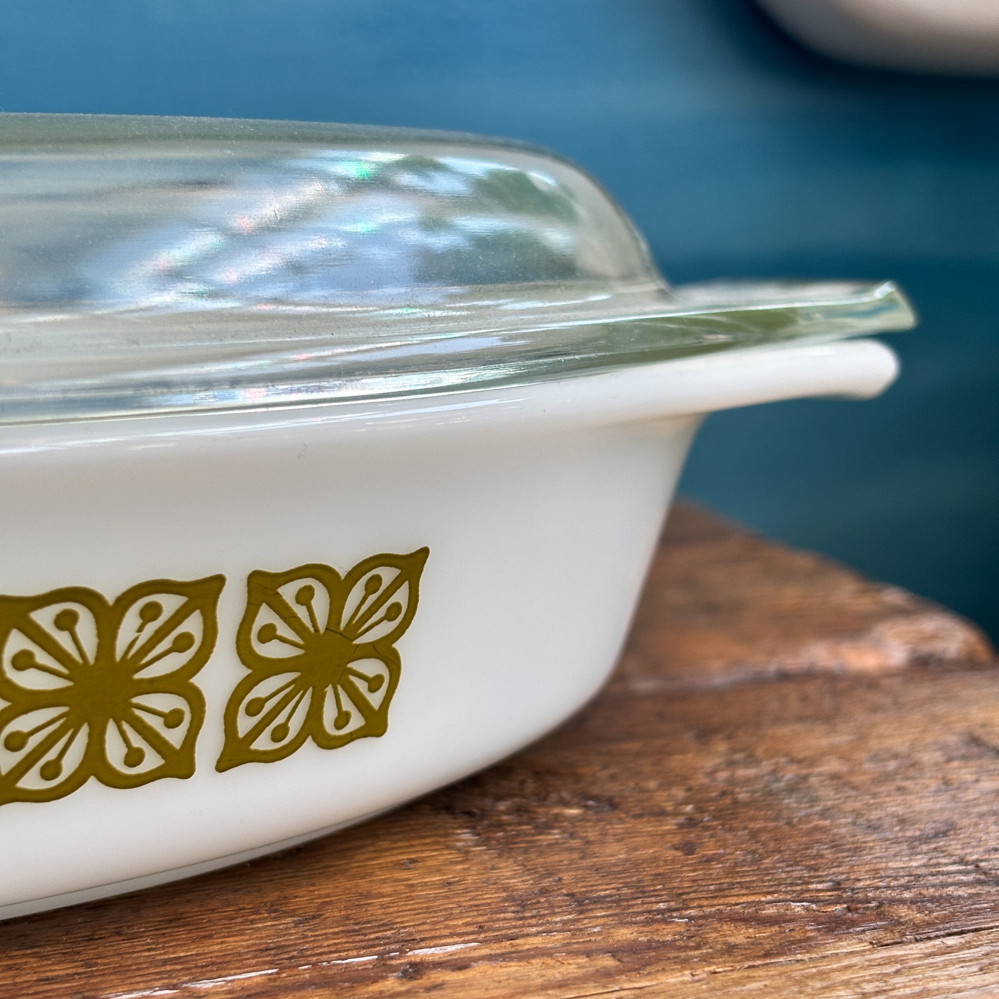 Vintage Pyrex 1960s Verde Square Floral Divided Casserole Dish with Lid. Add some groovy style to your kitchen with this vintage Pyrex casserole dish from the 1960s! With its charming Verde Square Floral design and convenient divided sections, your meal prep just got a whole lot cooler. Plus, the lid keeps your food fresh while you display it with pride.
